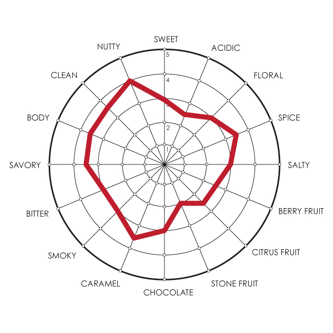 We created this wheel using our own cuppings to display this coffee’s flavor profile. The closer to the outside of the circle, the higher the coffee scores in that flavor category.